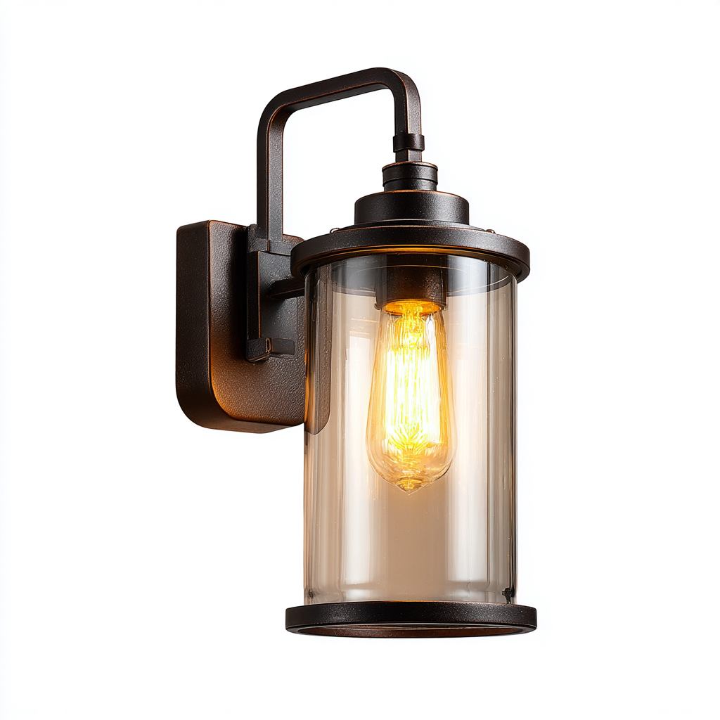 Este aplique de pared destaca por su diseño industrial, combinando una estructura metálica en color marrón oscuro con una pantalla cilíndrica de cristal transparente. Su estilo robusto y moderno aporta una iluminación cálida y decorativa ideal para interiores contemporáneos.