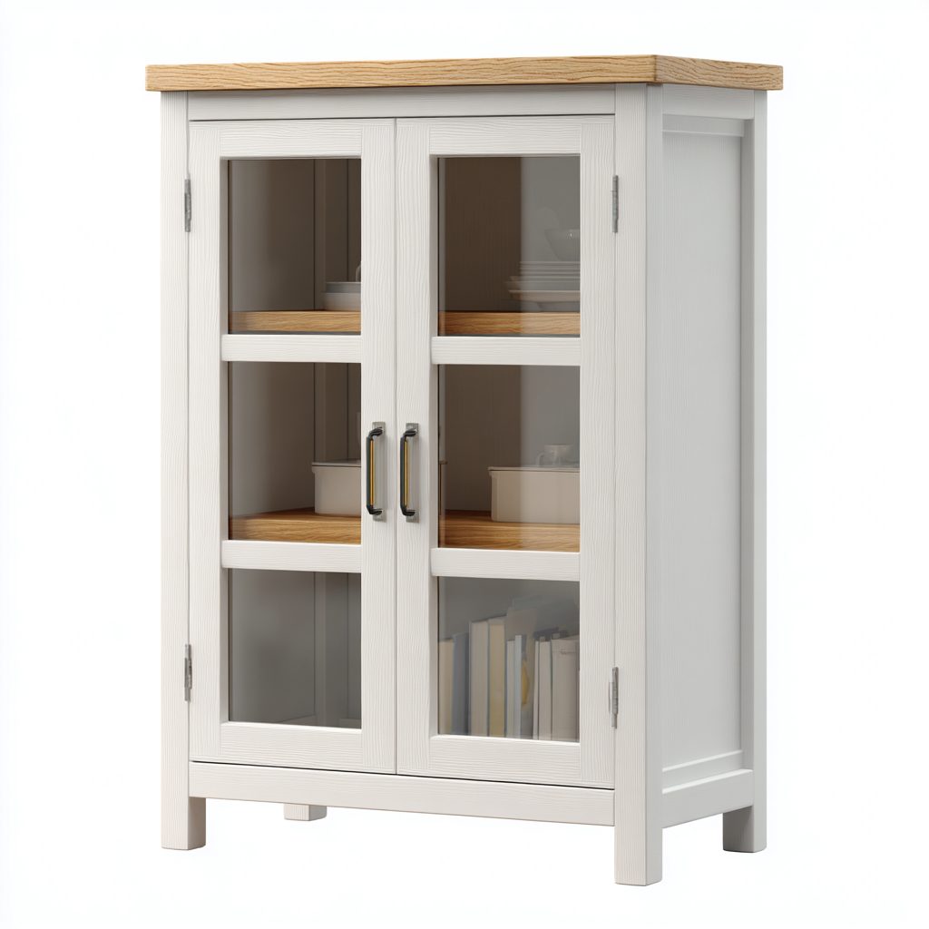 La estructura está fabricada en paneles de madera con acabado blanco, mientras que la superficie superior y los estantes interiores presentan un acabado en madera natural. Las puertas acristaladas brindan una visualización clara del contenido y aportan ligereza estética al mueble.