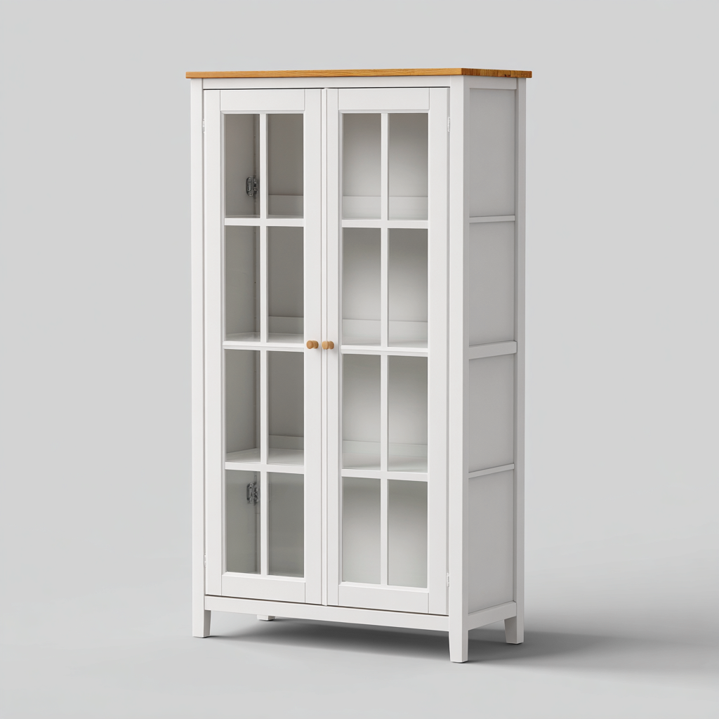 Dispone de dos puertas acristaladas con varios estantes interiores que permiten organizar platos, vasos y otros objetos de cocina. Su estructura alta proporciona una gran capacidad de almacenamiento y facilita el acceso al interior.