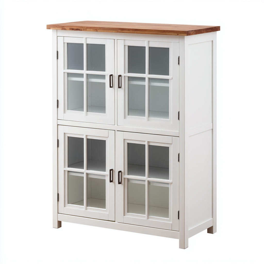 Cuenta con cuatro puertas acristaladas distribuidas en dos niveles, cada uno con estantes interiores amplios que facilitan el almacenamiento visible y organizado. Es adecuado para cocina y ayuda a mantener utensilios, recipientes y vajillas perfectamente ordenados.