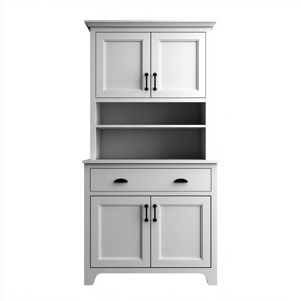 Incluye módulo superior con dos puertas, zona central con estantes abiertos para objetos de uso frecuente, cajón de almacenamiento práctico y módulo inferior con puertas para mantener utensilios ordenados. Es adecuado para cocina y contribuye a optimizar el espacio vertical.