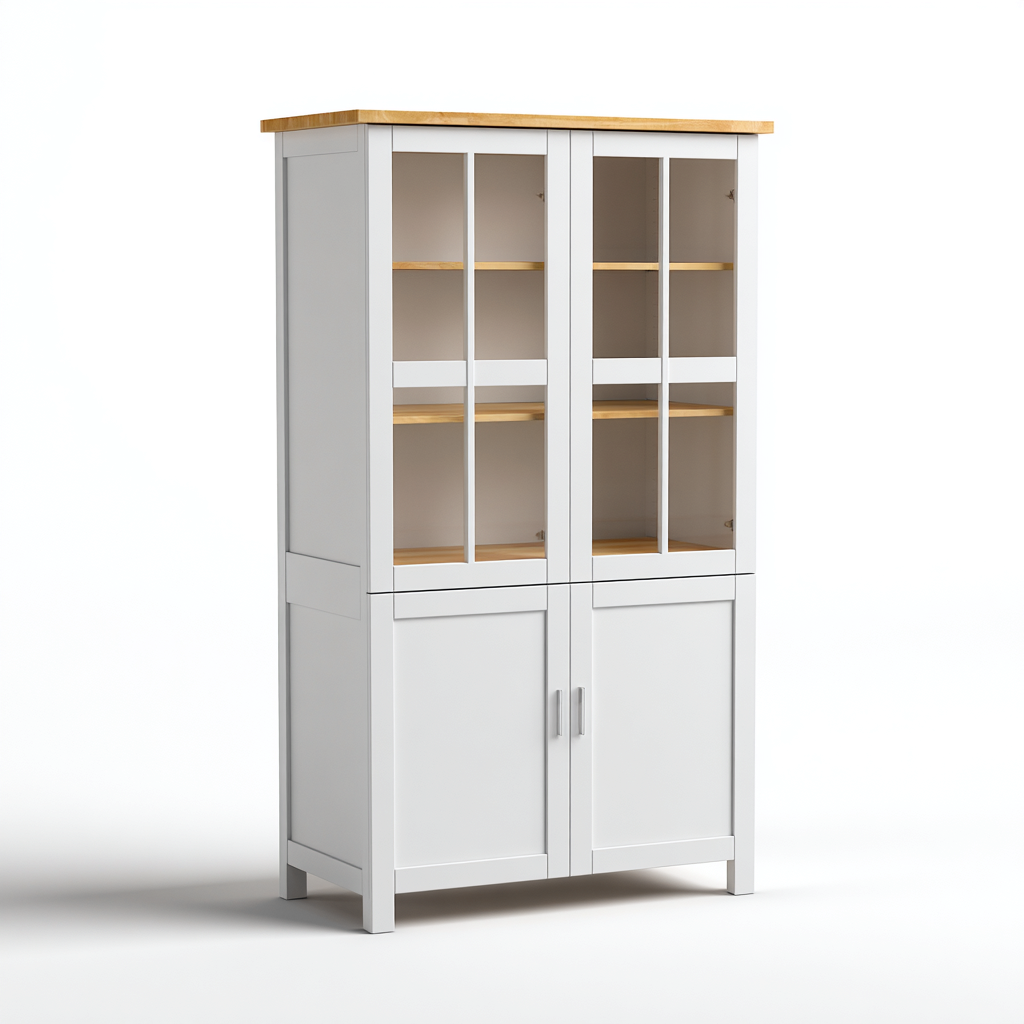 Incluye puertas superiores con vidrio transparente y estantes amplios para almacenamiento visible, además de un compartimento inferior con puertas dobles adecuado para artículos más grandes. Es adecuado para cocina y permite mantener utensilios, recipientes y vajillas organizados.