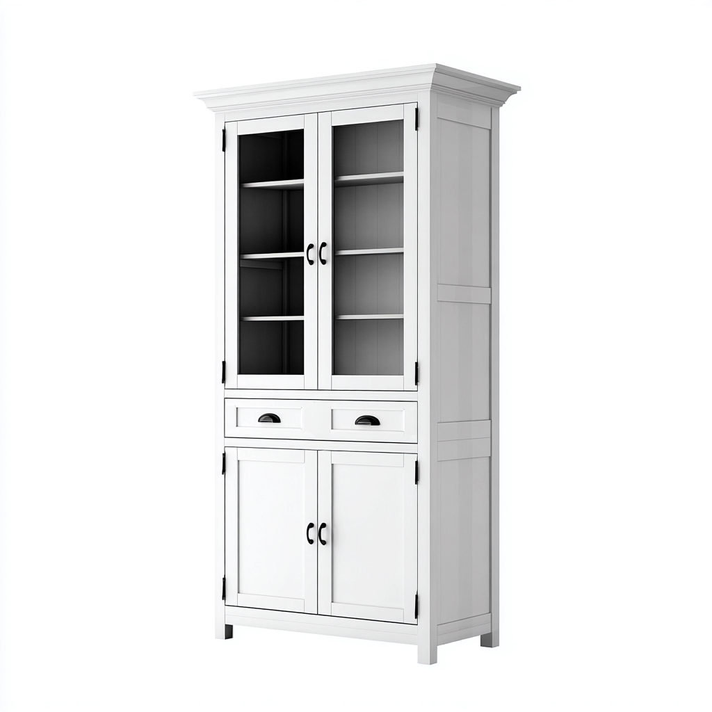 Este armario de cocina de estilo clásico ofrece una solución de almacenamiento amplia y bien organizada. Su estructura en color blanco combina puertas superiores acristaladas, cajones funcionales y un módulo inferior cerrado, permitiendo ordenar vajillas, recipientes y utensilios de uso diario.