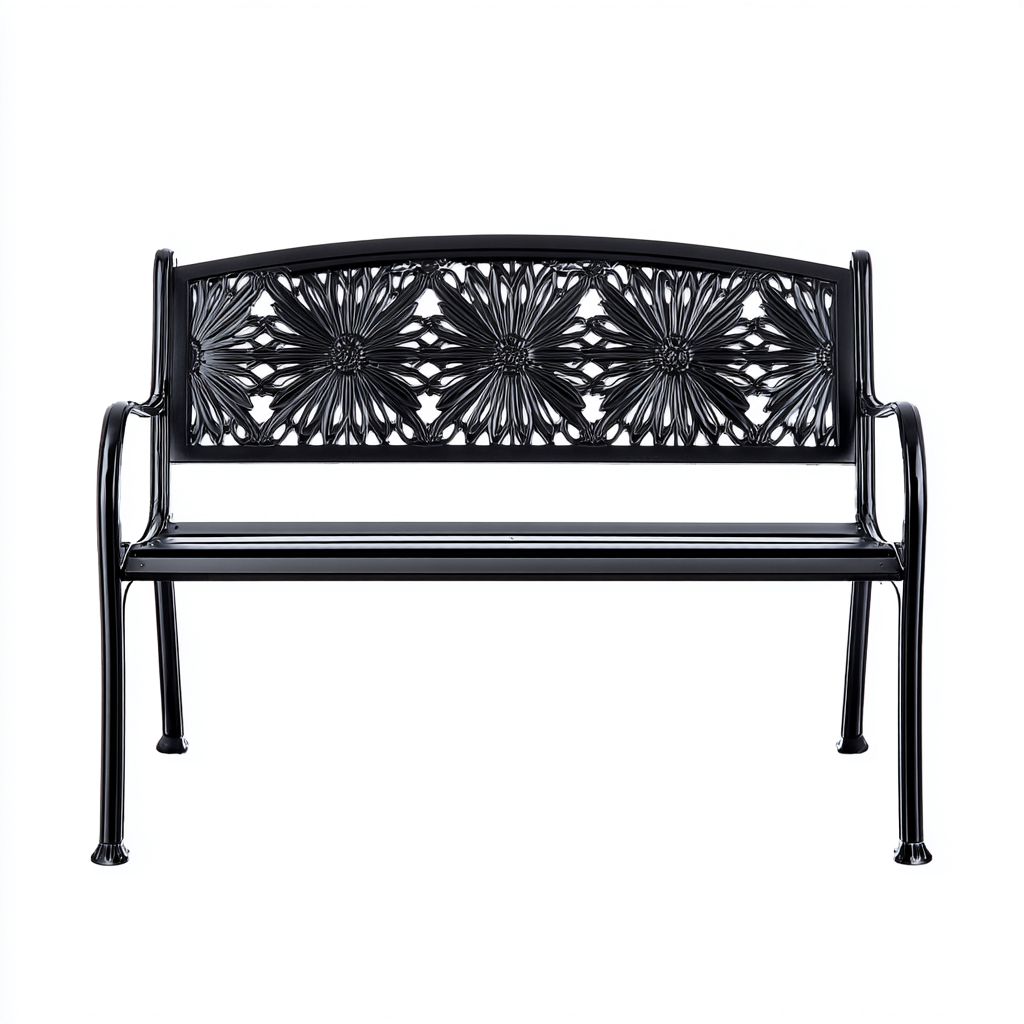 Este banco de jardín de dos plazas presenta un diseño clásico con un respaldo decorativo de flores caladas, ideal para terrazas, patios y diversas zonas exteriores. Su estructura metálica garantiza resistencia y estabilidad.