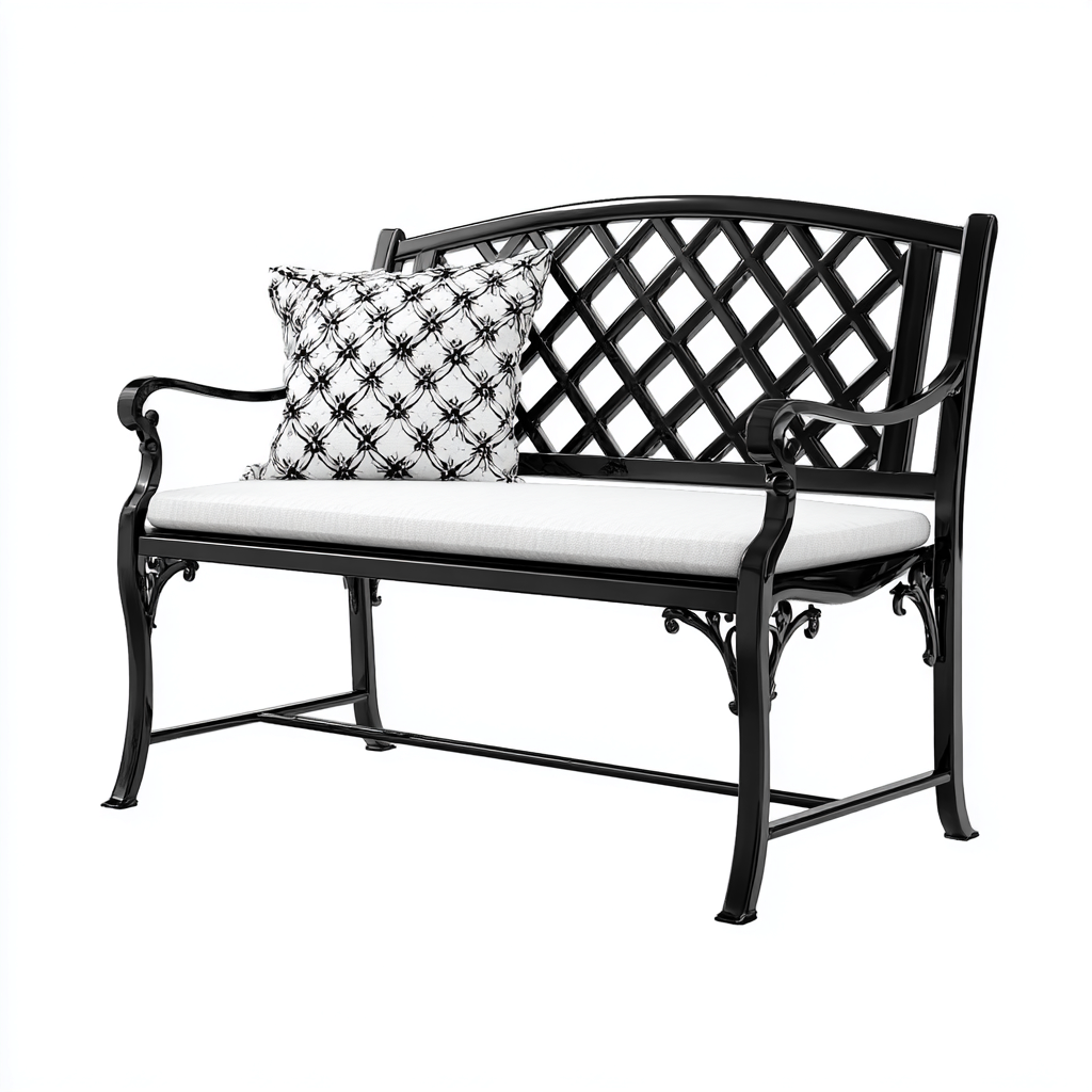 Este banco de jardín combina una estructura metálica resistente con un diseño decorativo de patrón entrecruzado, ideal para terrazas, balcones y patios. Su estilo clásico y elegante aporta un toque distintivo a cualquier espacio exterior.