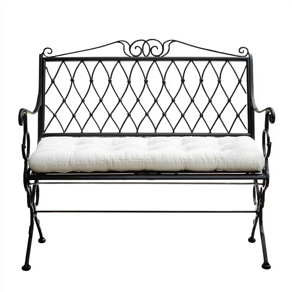 Fabricado en metal con acabado negro, incorpora un respaldo con patrón entrelazado y detalles decorativos en la parte superior, aportando un toque distintivo al entorno exterior.