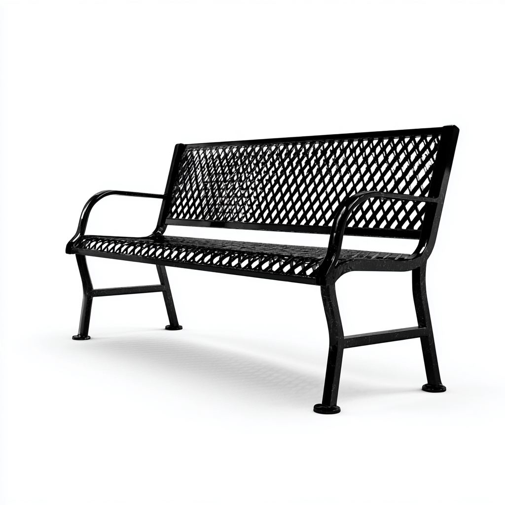 Fabricado en metal con acabado negro lacado, el banco presenta un respaldo y asiento con patrón calado en forma de rombos, lo que mejora la ventilación y aporta un estilo visual dinámico.