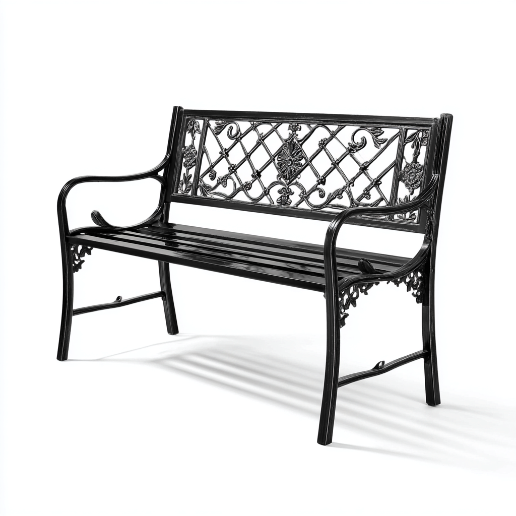 Este banco de jardín de metal decorativo presenta un diseño clásico con un respaldo ornamentado ideal para terrazas, patios y zonas exteriores.