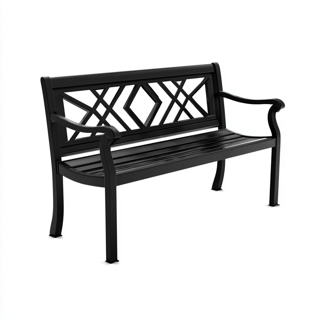 Este banco de jardín de metal resistente ofrece una estética elegante en color negro con un respaldo decorativo ideal para terrazas, patios y zonas exteriores.