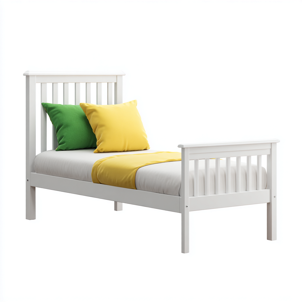 Esta cama infantil de madera ofrece un espacio cómodo y seguro para el descanso diario de los niños. Su diseño clásico con cabecero y piecero de lamas aporta un estilo limpio y armonioso al dormitorio infantil.
