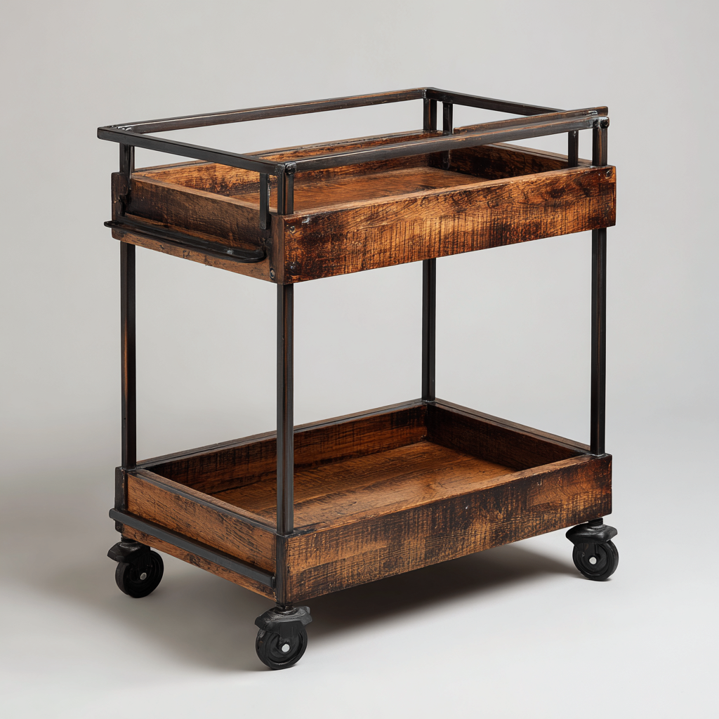Este carrito de cocina de estilo industrial combina una estructura metálica negra con bandejas de madera oscura, creando una pieza robusta y funcional ideal para almacenar utensilios, bebidas o accesorios del hogar. Su diseño de dos niveles permite una organización eficiente para diferentes necesidades.