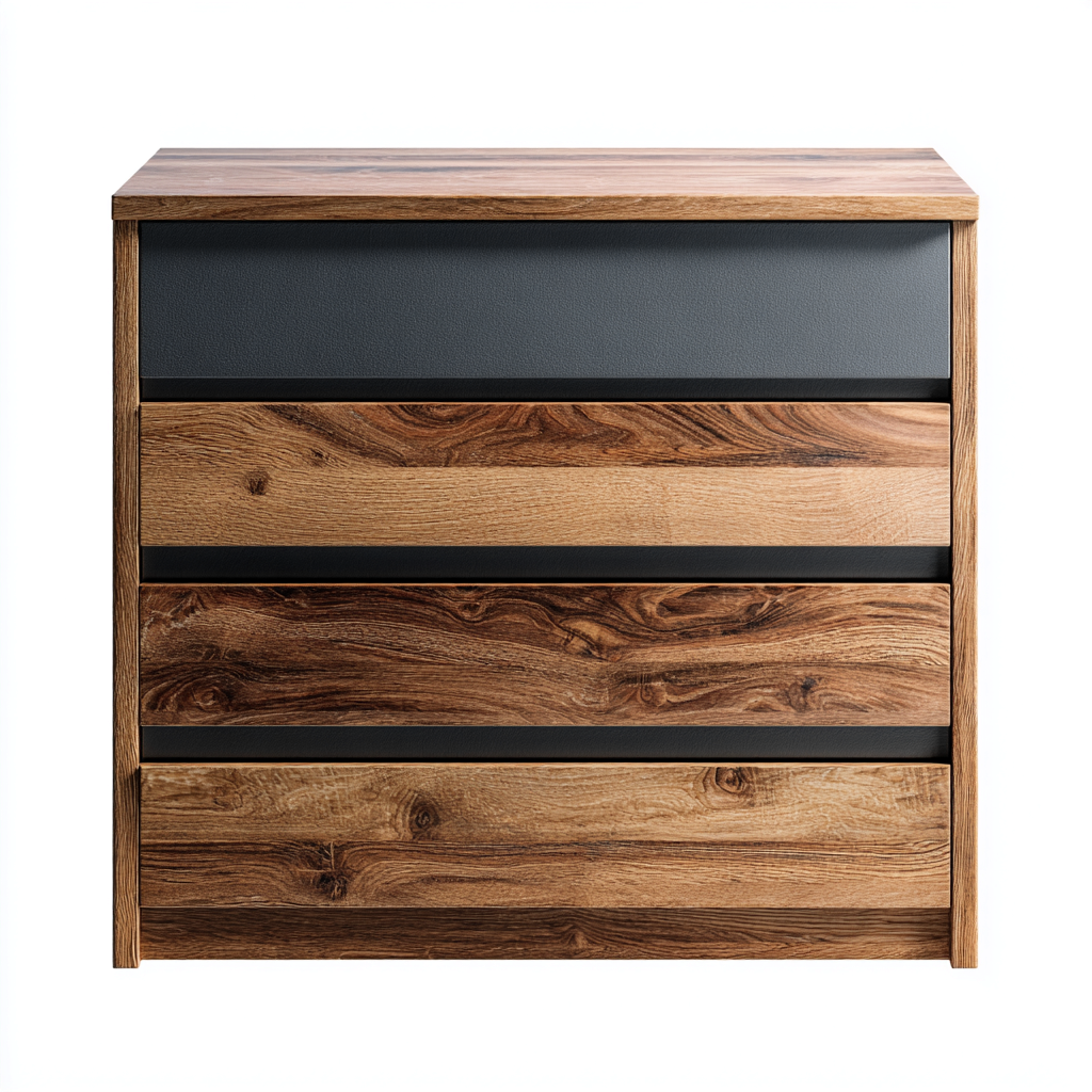 La estructura está fabricada en tablero de madera con acabado en tono natural combinado con paneles frontales en color gris. Los cajones cuentan con guías de desplazamiento suave para un uso cómodo y duradero.