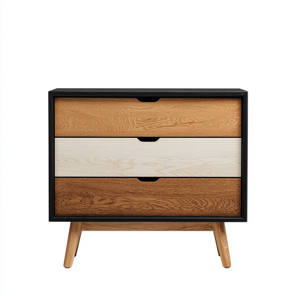 Esta cómoda de estilo nórdico combina un marco negro moderno con frentes de madera en tonos naturales contrastados. Su diseño limpio y equilibrado aporta un toque decorativo mientras ofrece un espacio funcional para organizar pertenencias en el dormitorio u otros espacios del hogar.