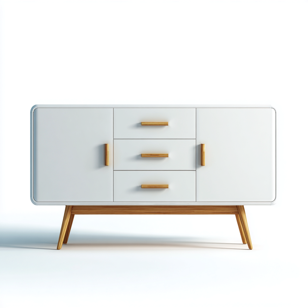 El cuerpo está fabricado en MDF con acabado blanco mate, mientras que las patas y tiradores están elaborados en madera clara para ofrecer un contraste natural. Las líneas suaves y los bordes redondeados refuerzan la estética nórdica y moderna.