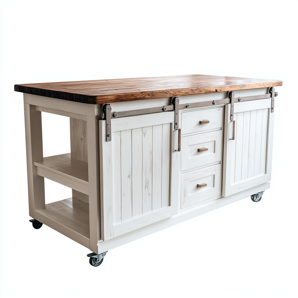Incluye puertas correderas, tres cajones centrales y estantes abiertos laterales ideales para organizar utensilios y accesorios de cocina. Las ruedas inferiores facilitan el desplazamiento y permiten ajustar la posición de la isla según las necesidades del espacio.