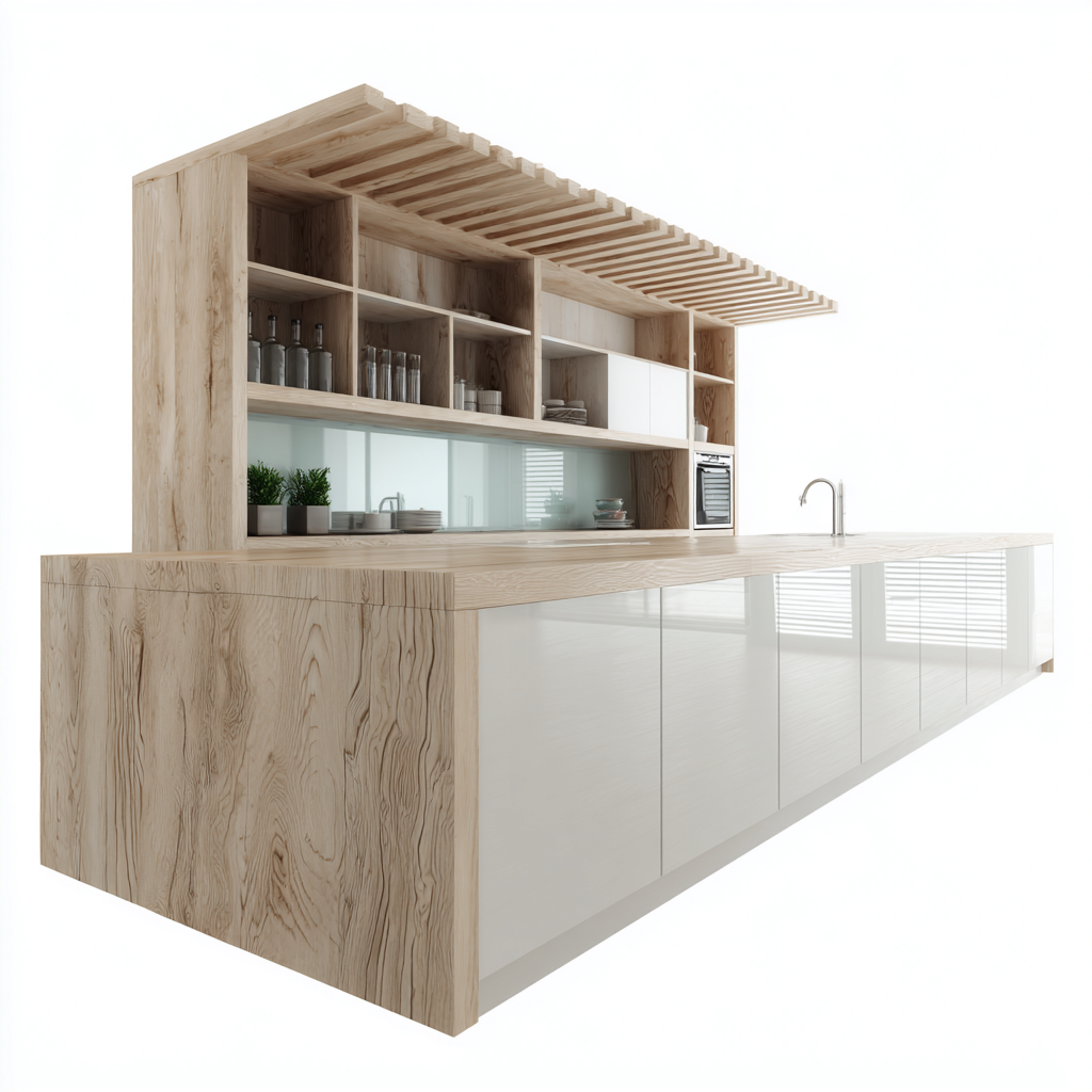Estructura fabricada en madera con textura natural de roble claro, combinada con paneles inferiores en acabado alto brillo color blanco. Incorpora estantes abiertos superiores y una encimera amplia que facilita el trabajo diario. Los elementos están elaborados para garantizar resistencia, estabilidad y una apariencia duradera.