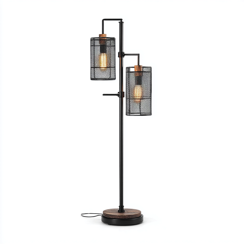 Esta lámpara de pie de estilo industrial combina una estructura metálica negra con una base de madera y dos pantallas cilíndricas de rejilla metálica. Su diseño robusto y contemporáneo aporta personalidad a salones, estudios o rincones de lectura.