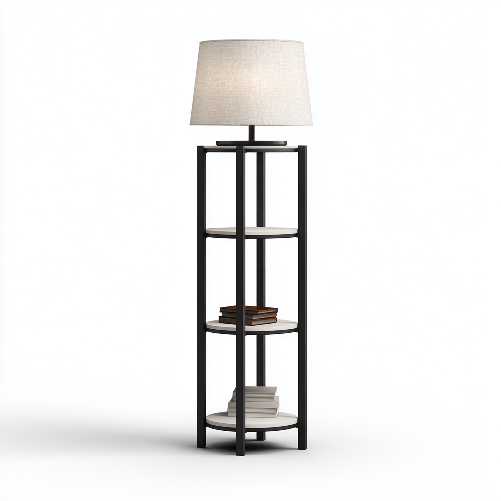 Incluye tres estantes prácticos para colocar libros y objetos decorativos. La pantalla textil asegura una luz suave, ideal para crear un ambiente acogedor. La base es estable y adecuada para el uso diario.