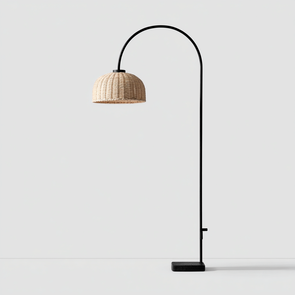 Esta lámpara de pie destaca por su estructura arqueada en metal negro y una pantalla tejida de ratán natural. Su estilo moderno con acentos naturales aporta una iluminación cálida y un toque decorativo a salones, dormitorios o zonas de lectura.