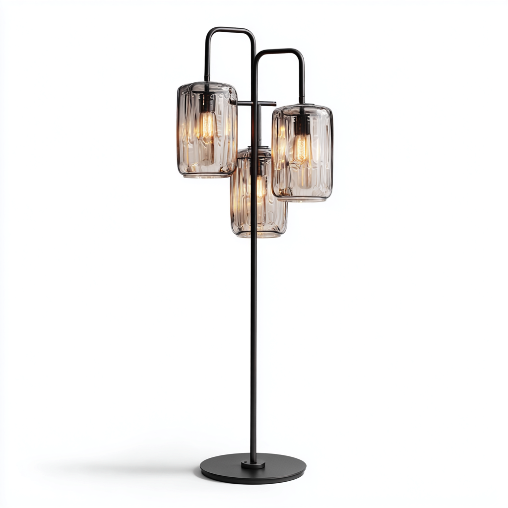 Esta lámpara de pie combina una estructura metálica negra con tres pantallas colgantes de cristal transparente ahumado, ofreciendo un estilo moderno y elegante adecuado para salones y zonas de estar. Su diseño vertical estilizado aporta una iluminación cálida y decorativa.
