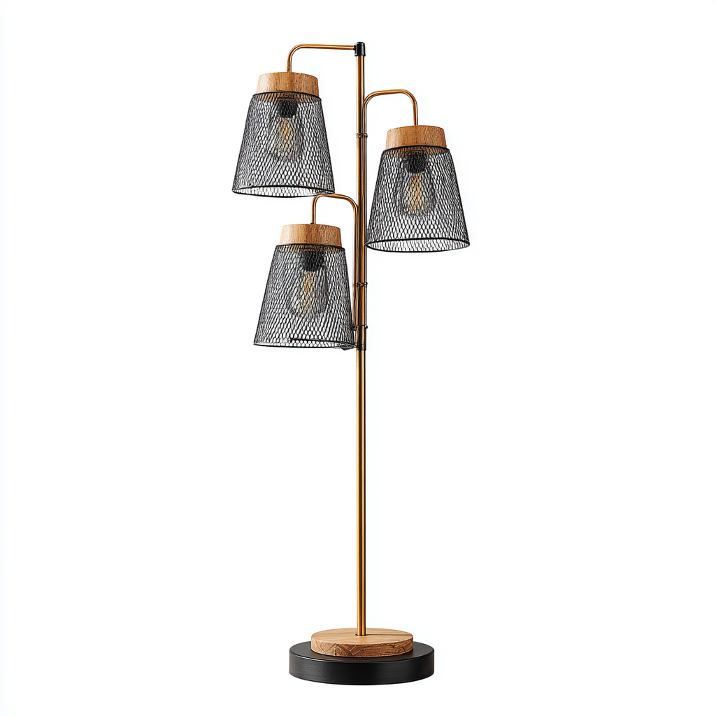 Esta lámpara de pie combina una estructura metálica en color dorado con tres pantallas de malla metálica negra y detalles en madera, ofreciendo un diseño moderno y decorativo ideal para salones y áreas de estar. Su distribución de luz múltiple permite crear un ambiente cálido y equilibrado.