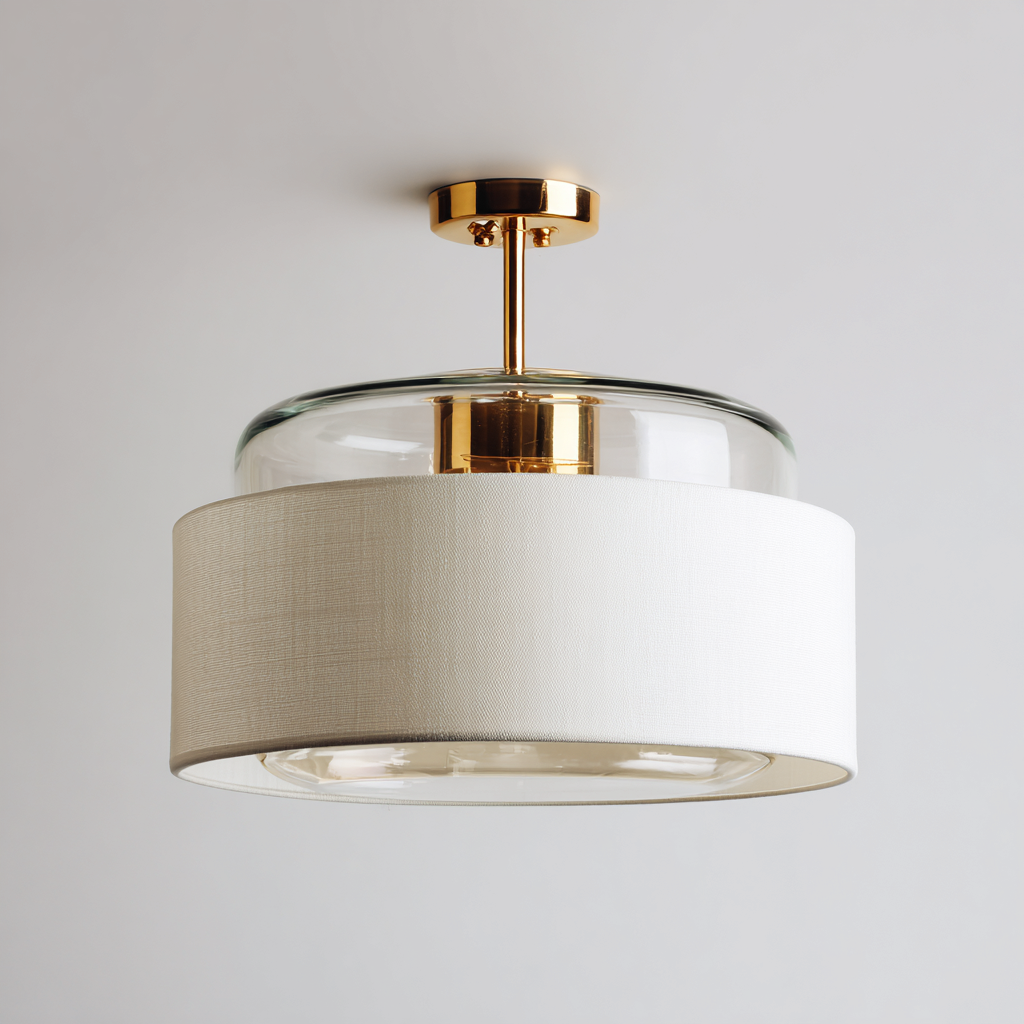 Esta lampara de techo combina una estructura metalica en acabado dorado con un difusor superior de vidrio transparente y una pantalla inferior de tela blanca. Su diseno moderno aporta una iluminacion equilibrada adecuada para dormitorios, salas de estar y pasillos.