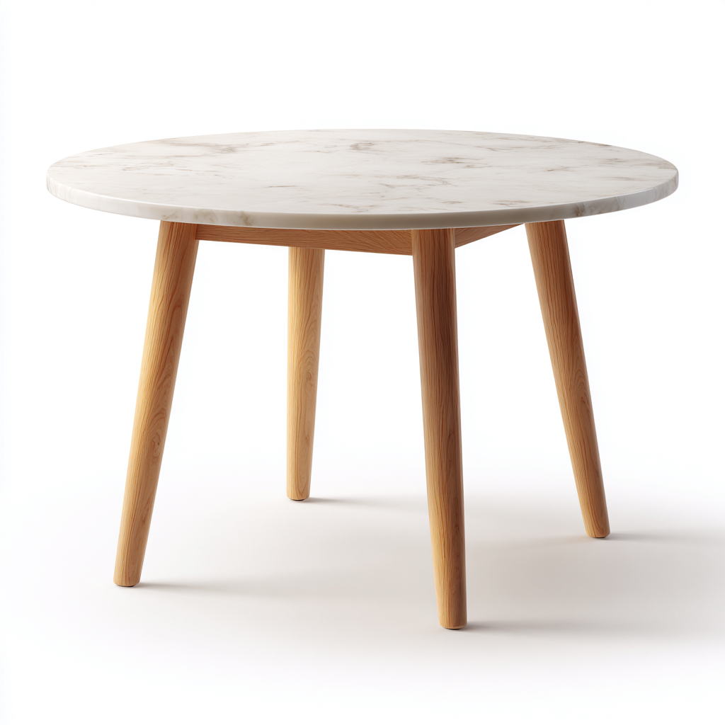 La tapa presenta un acabado blanco con efecto mármol, fácil de limpiar y resistente al uso exterior. Las patas están fabricadas en madera con tono natural, proporcionando estabilidad y un aspecto cálido.