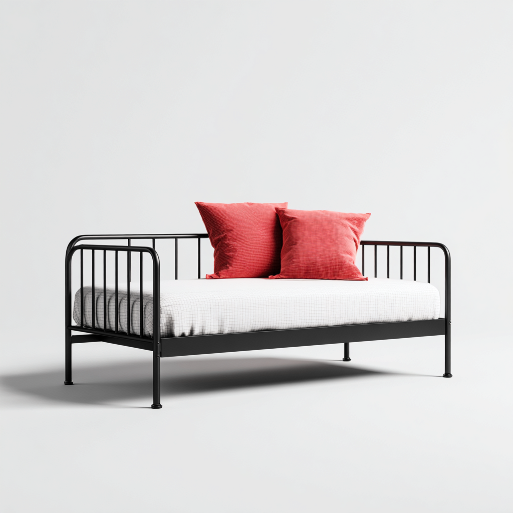 Este sofá cama metálico ofrece un diseño minimalista con líneas limpias y una estructura estable. Su superficie en color blanco proporciona comodidad para uso diario en sala de estar o dormitorio.
