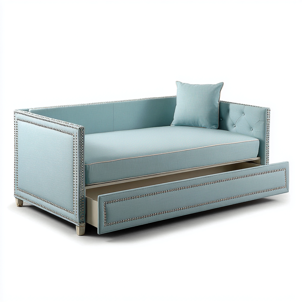 Este sofá cama tapizado ofrece una solución versátil para dormitorios y zonas de descanso. Su estructura lateral y respaldo permiten usarlo como sofá durante el día y como cama durante la noche, adaptándose a diferentes necesidades del hogar.