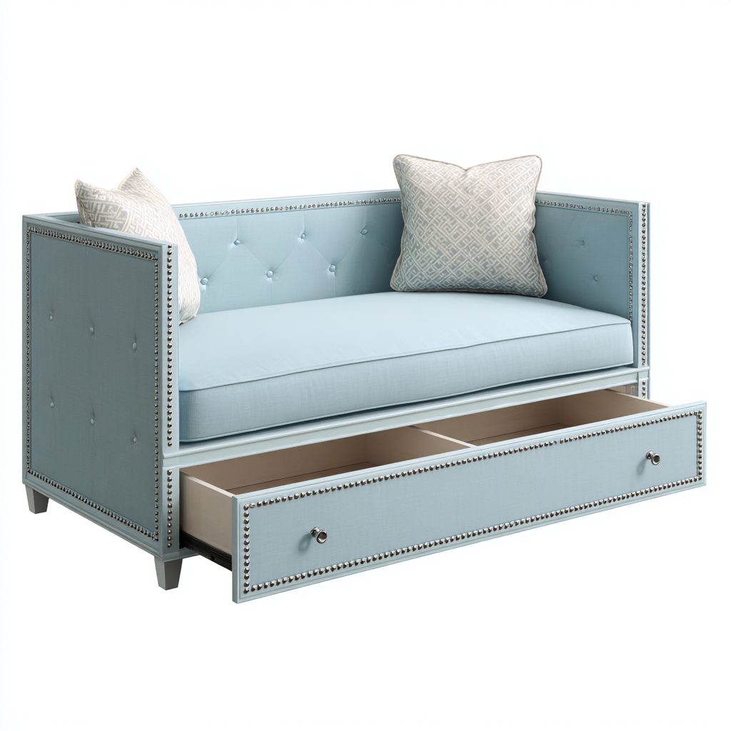 El sofá cama incorpora un cajón inferior de almacenamiento que permite guardar objetos de uso frecuente. Su diseño compacto optimiza el espacio y facilita la organización del hogar.