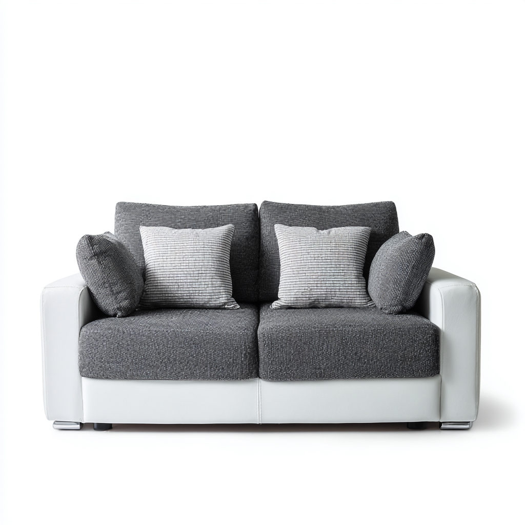 El sofá presenta una estructura sólida con base en color blanco y asientos tapizados en gris. Los materiales están seleccionados para ofrecer durabilidad y una sensación agradable al sentarse.