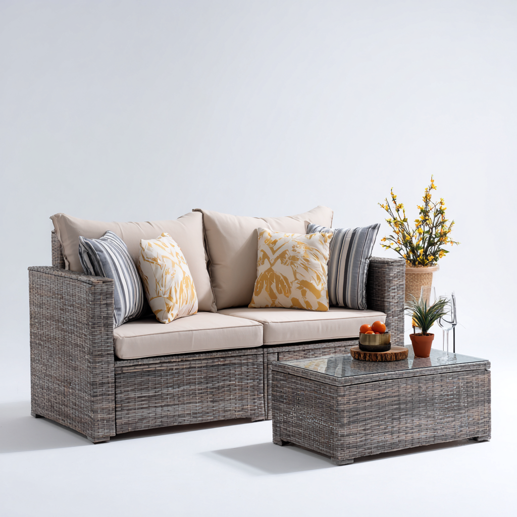 Este conjunto de sofá de jardín ofrece una solución completa para crear un espacio exterior cómodo y funcional. Su diseño moderno en tonos gris y blanco lo convierte en una opción versátil para terrazas, patios y jardines.