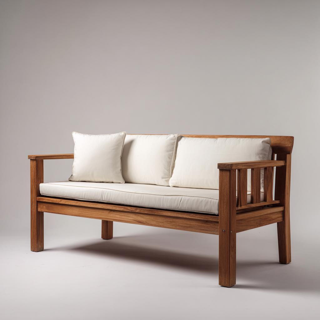 Este sofá de jardín de tres plazas combina un diseño natural con líneas simples y funcionales. Su estructura de madera y los cojines en tono beige crean un ambiente acogedor ideal para terrazas, jardines y porches.